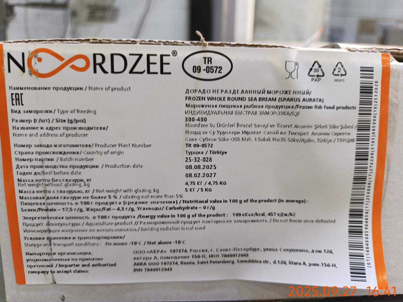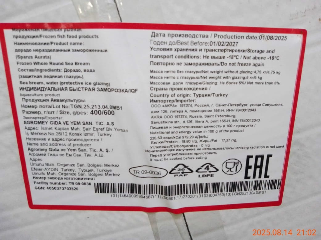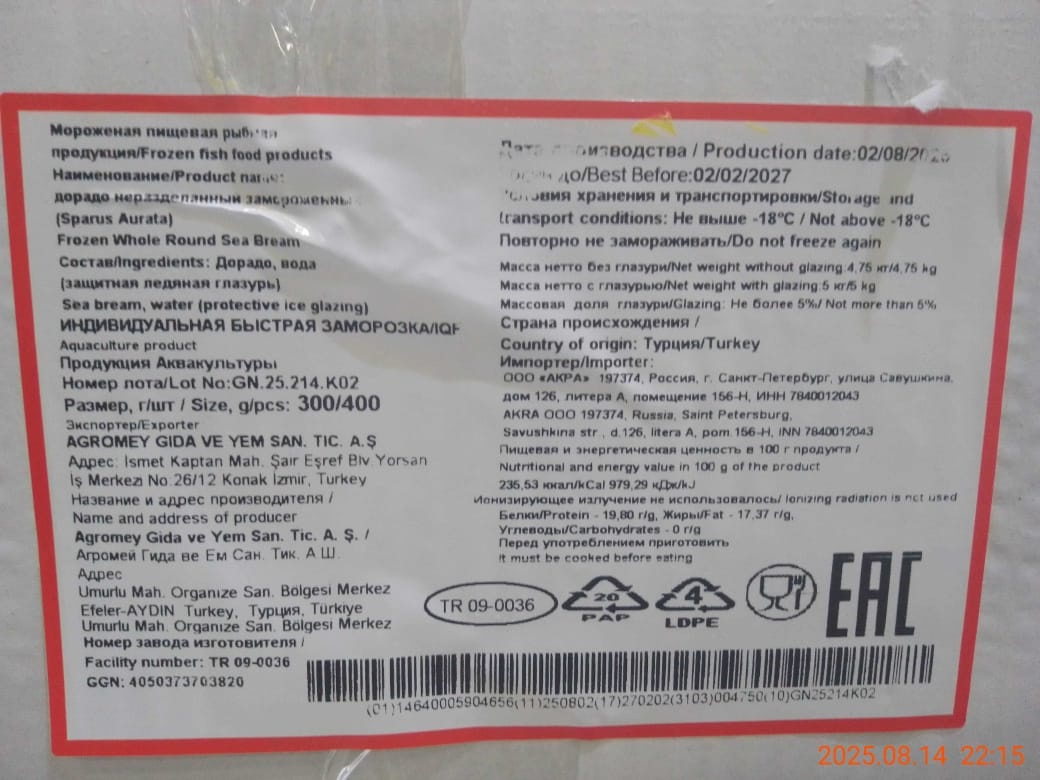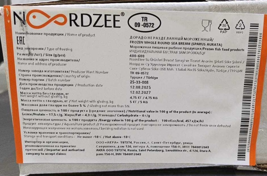 Дорадо, н/р, с/м, индивид, не более 5%, 400-600 гр/шт, карт., 5 кг, ТУРЦИЯ (TR 09-0572)