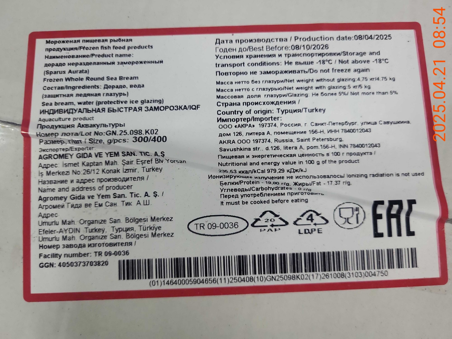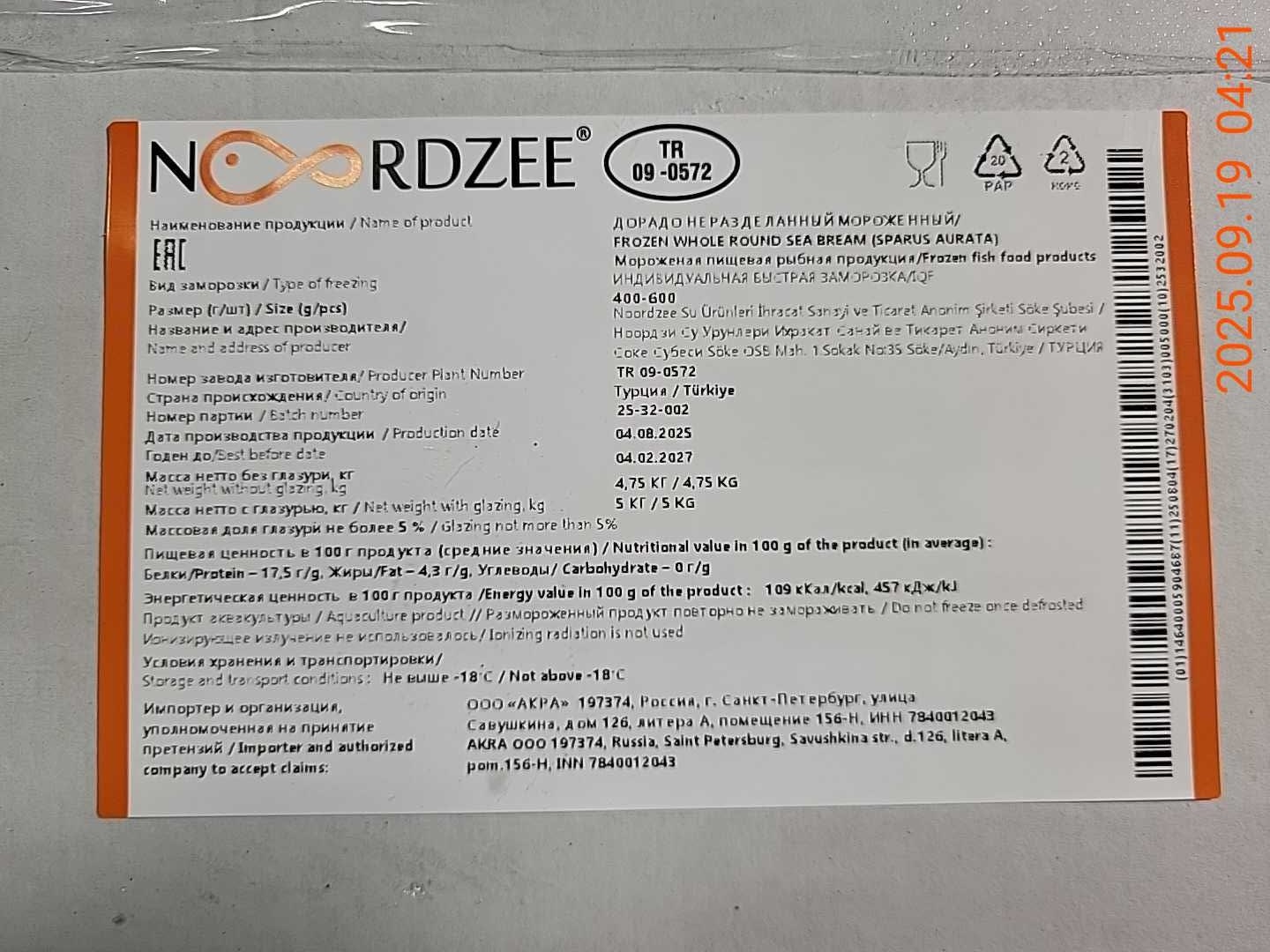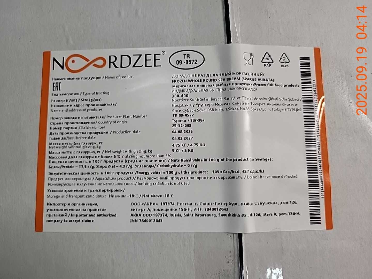 Дорадо, н/р, с/м, индивид, не более 5%, 400-600 гр/шт, карт., 5 кг, ТУРЦИЯ (TR 09-0572)