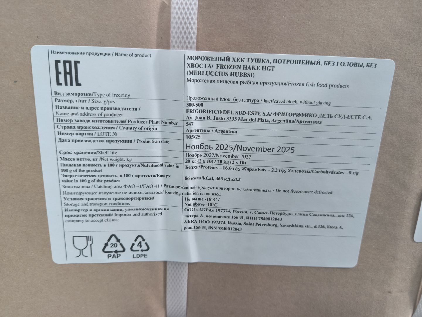 Хек хубси, тушка, с/м, блок, 80-300 гр/шт, пролож., карт., 12 кг (2756)