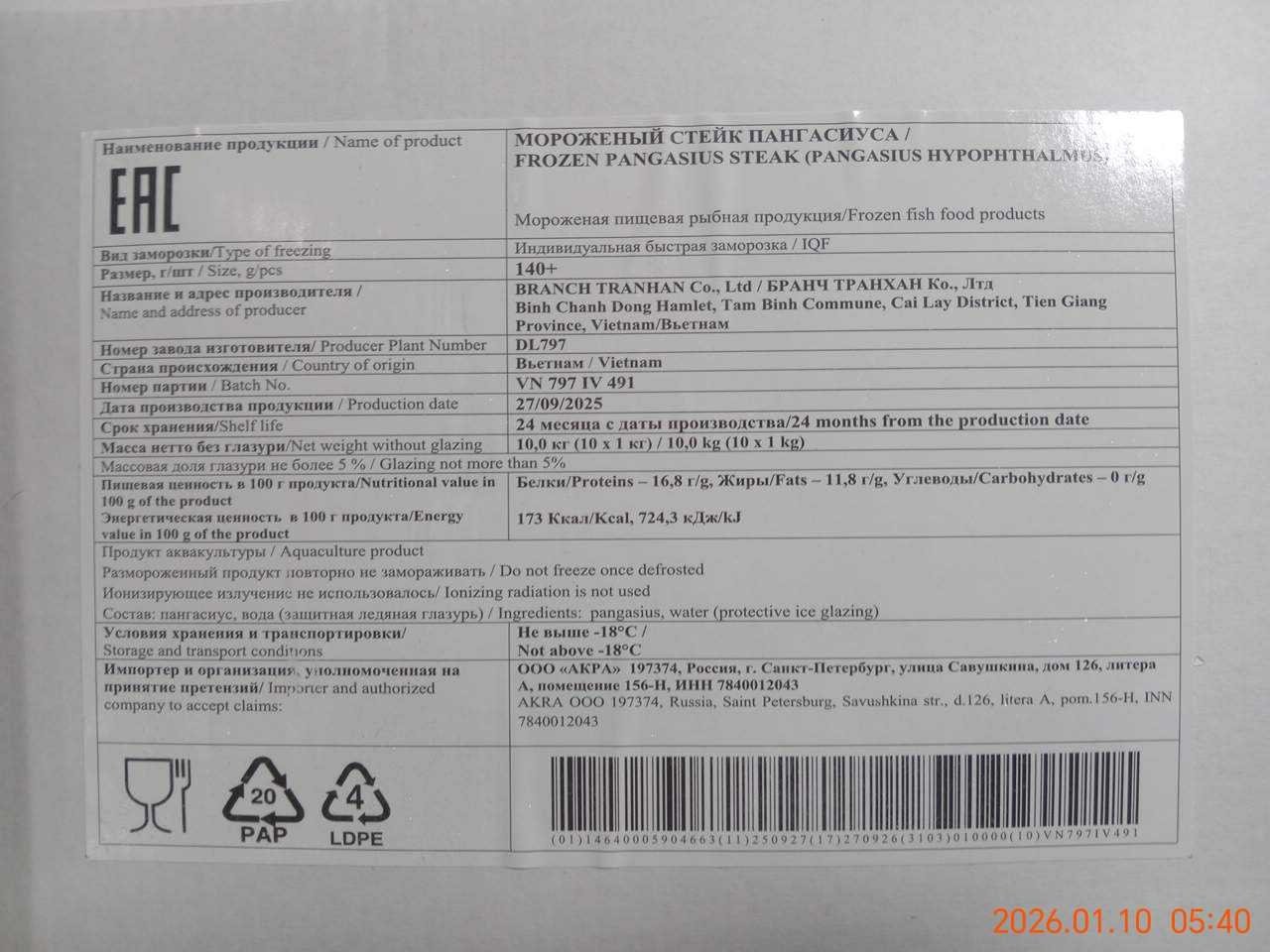 Стейки пангасиуса, выращенного в специально обустроенных прудах со строгим контролем экологических и санитарных условий.