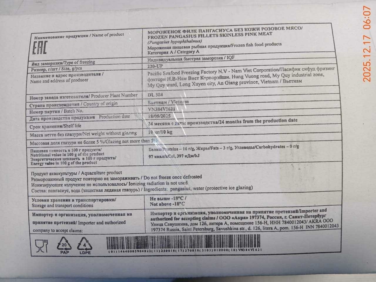 Филе пангасиуса, выращенного в специально обустроенных прудах со строгим контролем экологических и санитарных условий.