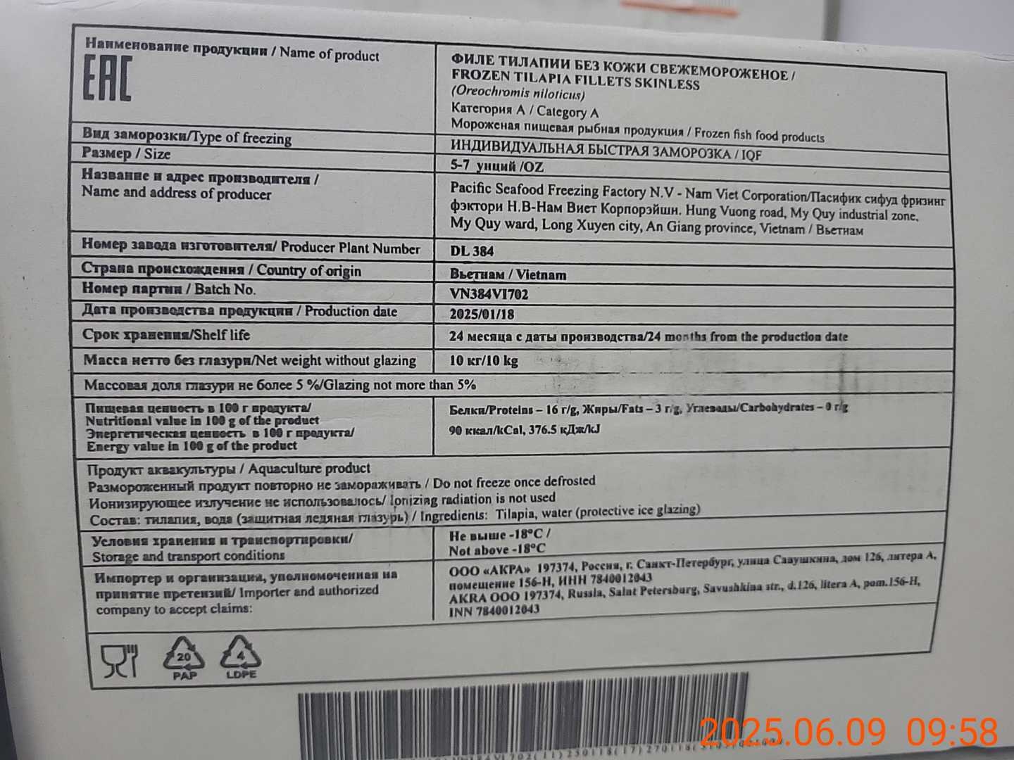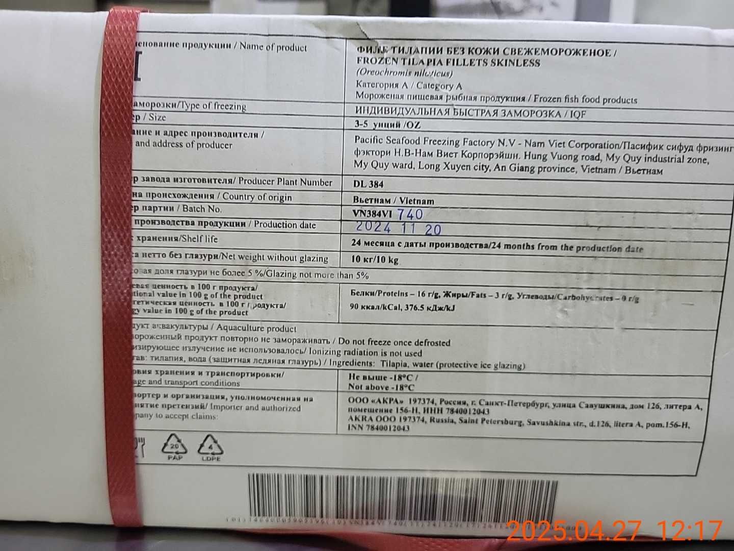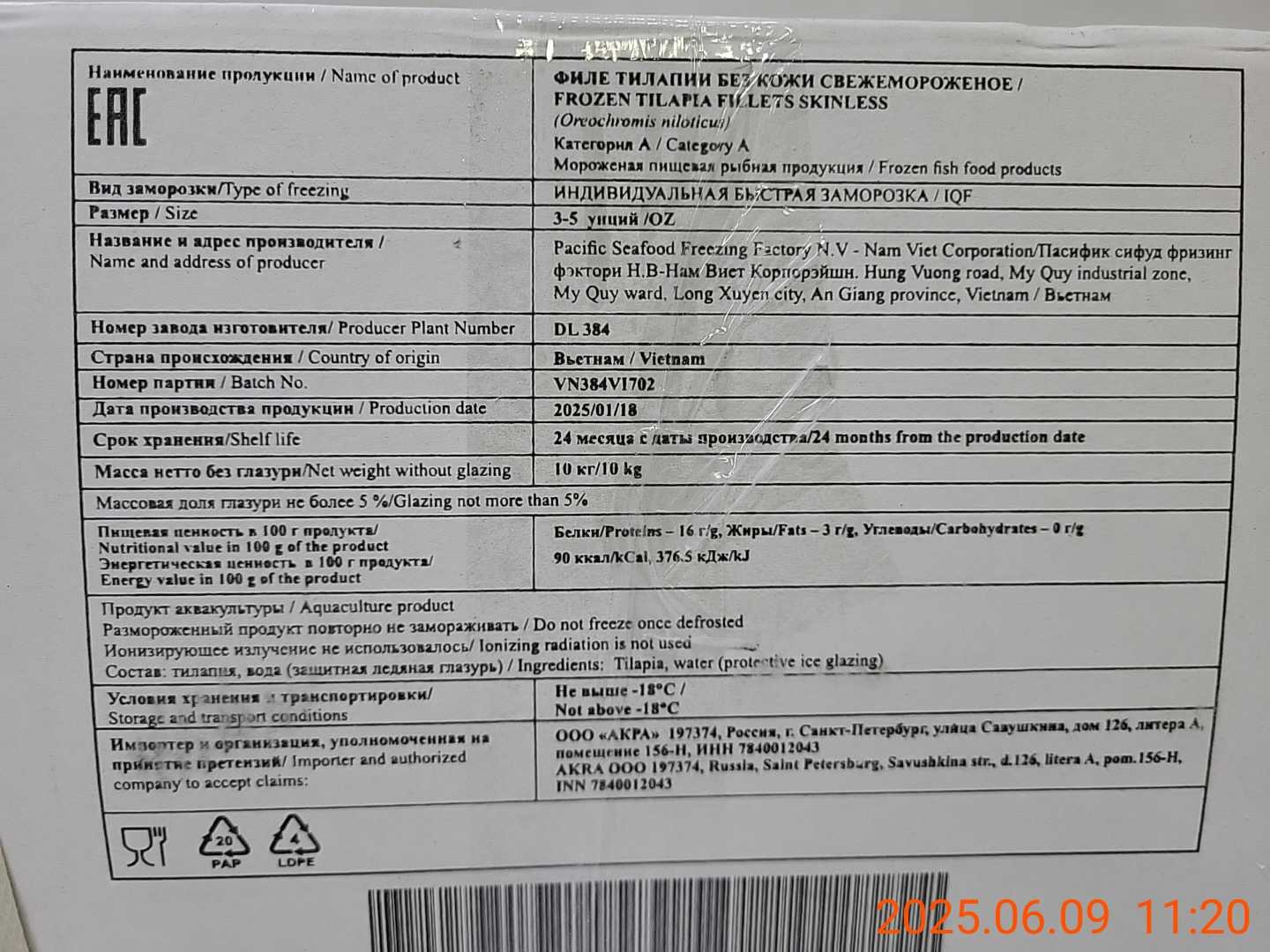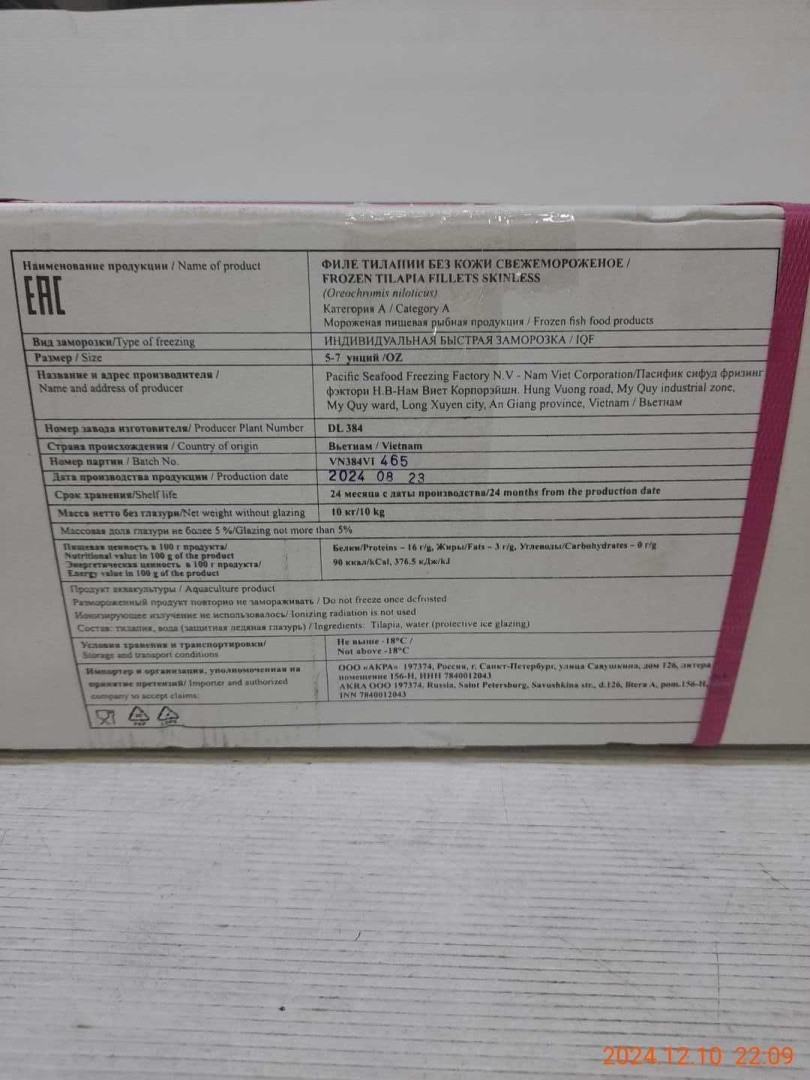 Тилапия, филе б/к, с/м, индивид, не более 5%, 3-5 унц/шт, карт., 10 кг (4600/02059)