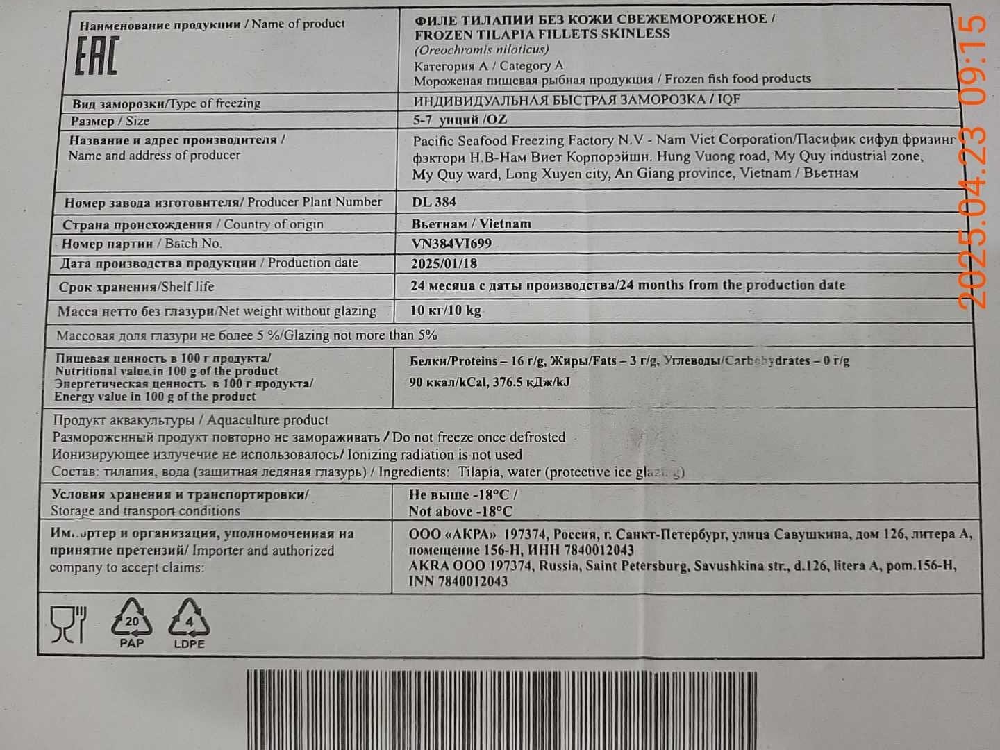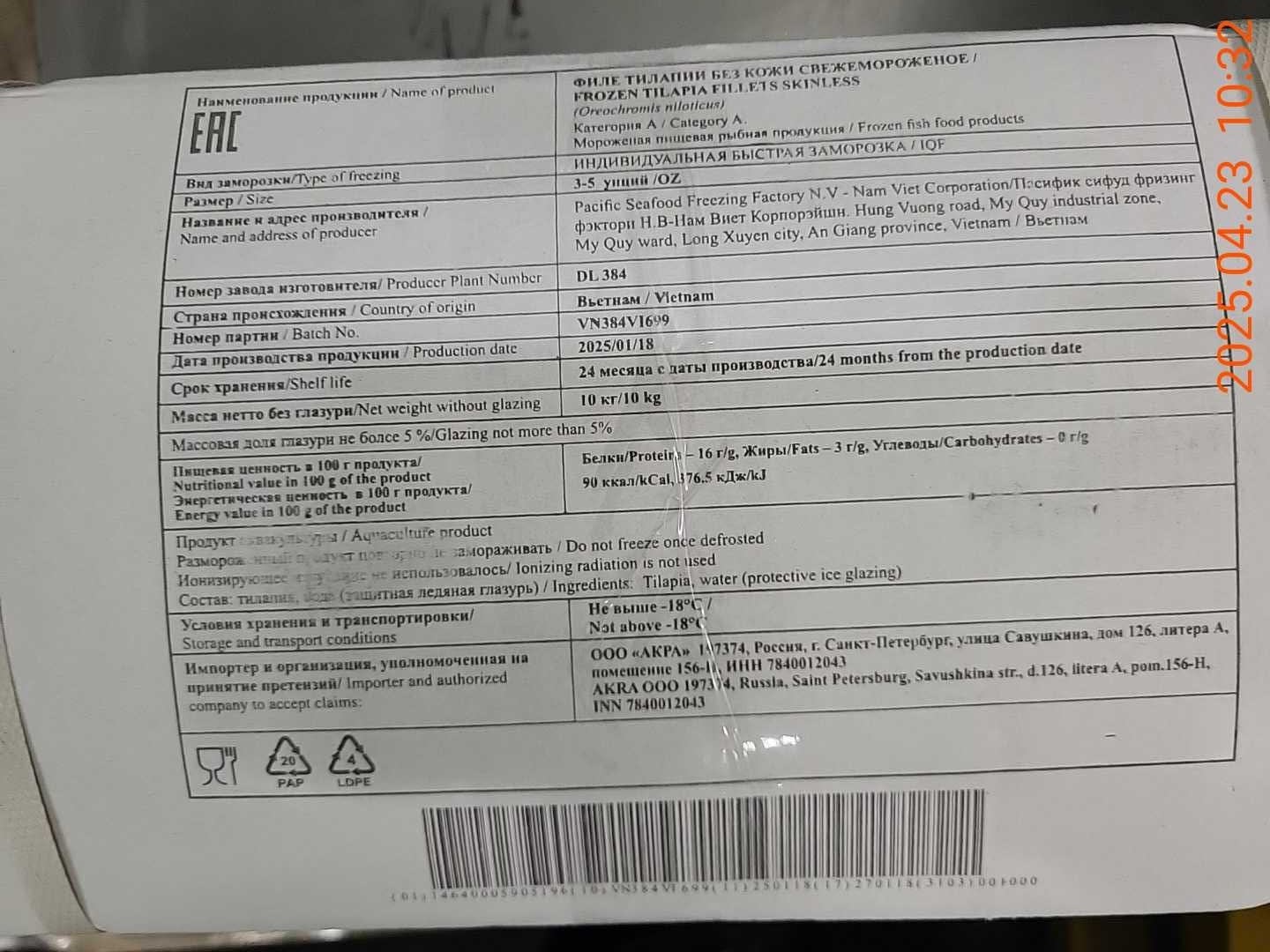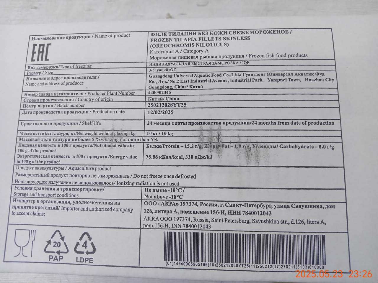 Тилапия, филе б/к, с/м, индивид, не более 5%, 3-5 унц/шт, карт., 10 кг (4600/02059)