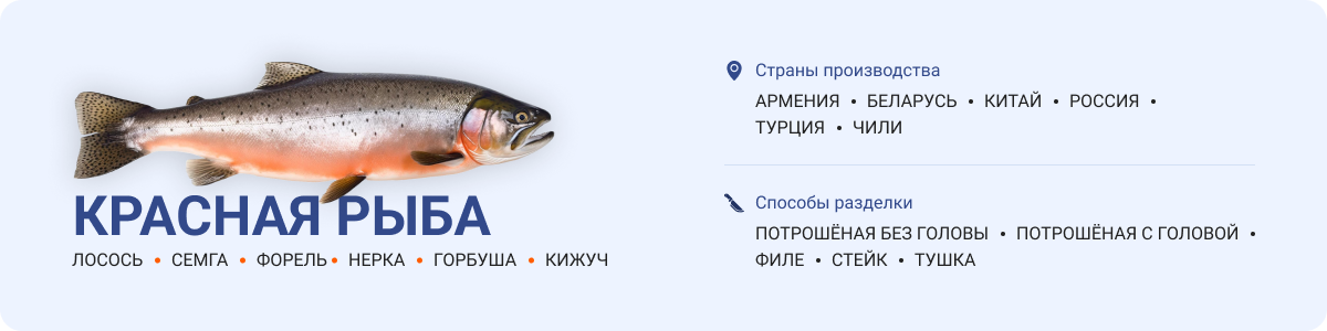 В каталоге Defa Group представлены основные сорта красной рыбы, которые используются в профессиональной кулинарии. Среди них лосось , семга , форель, а также нерка, горбуша и кижуч.