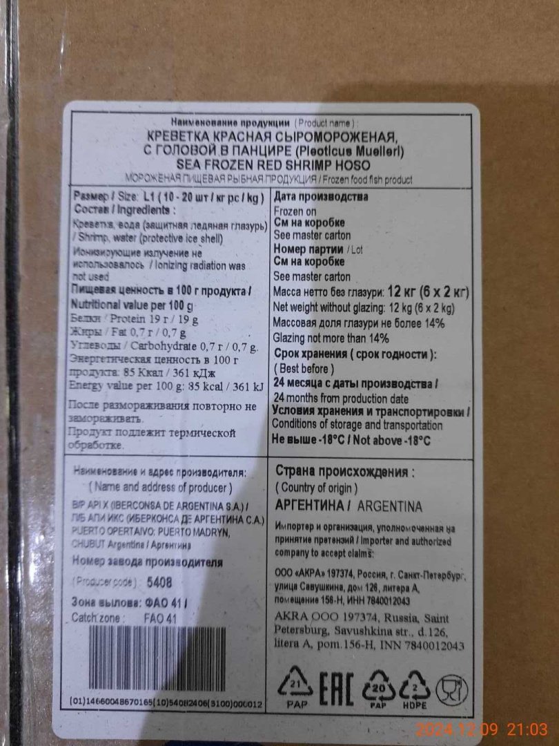 Мясо нежное и сочное, со сладковатым вкусом, в сыром виде имеет насыщенный красный цвет. Буквой «L» обозначают аргентинскую креветку c головой в панцире (целую). Является диетическим продуктом, содержит большое количество белка и минимум жиров.