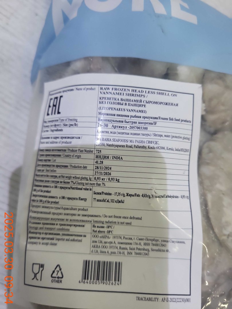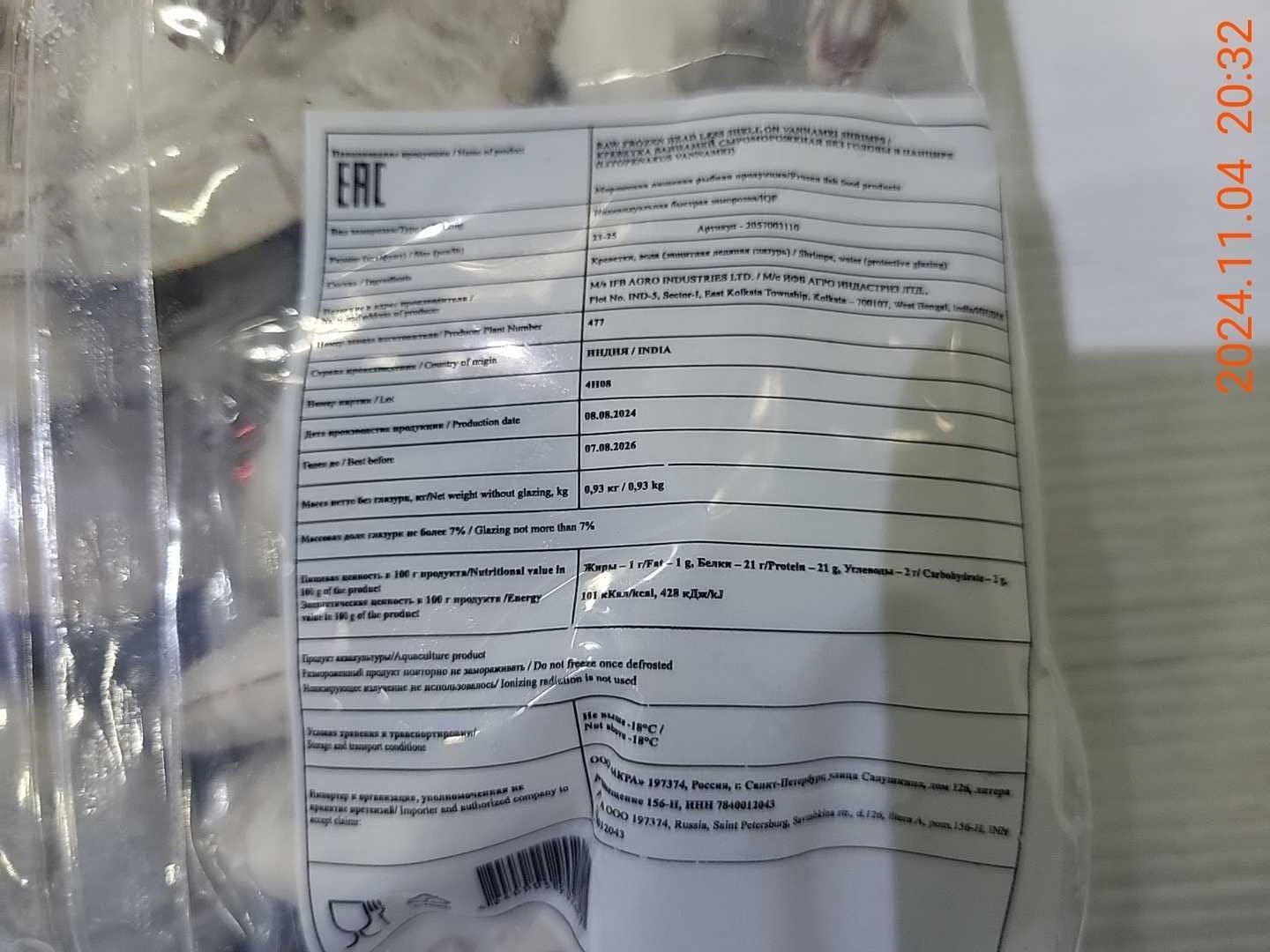 Креветка Ваннамей, б/г в панц., с/м, индивид, не более 7%, 21-25 шт/фунт 0,93 кг, карт., 9,3 кг, Fish & More Переработка импорт (477)