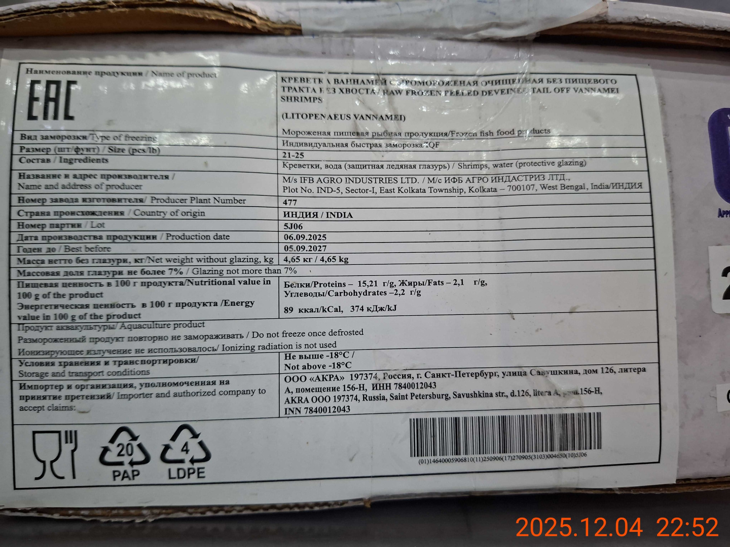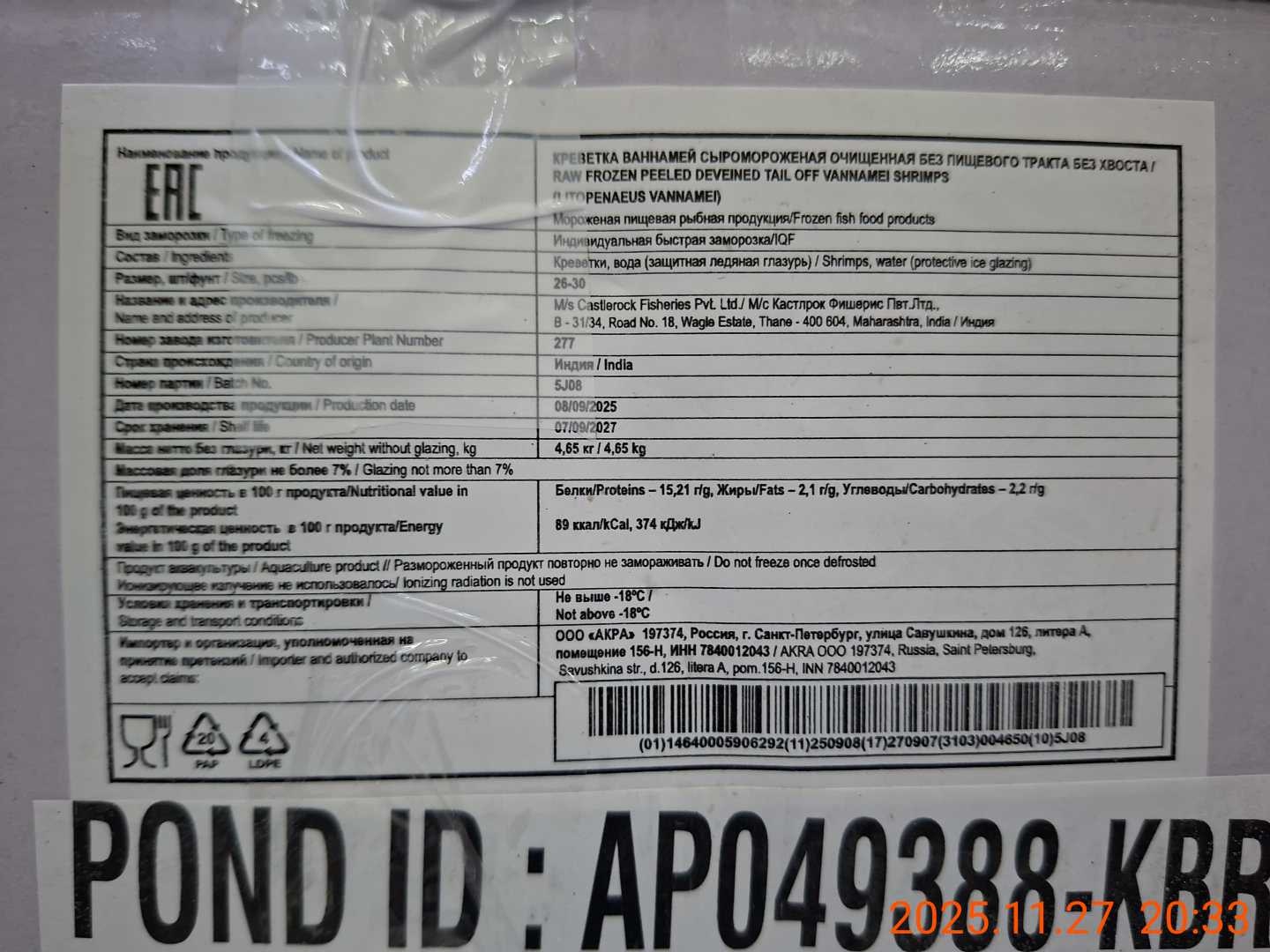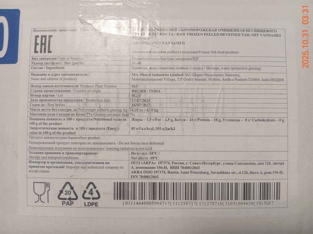 Креветка Ваннамей, очищ. б/пищ., с/м, индивид, не более 7%, 31-40 шт/фунт, карт., 4,65 кг (1581)