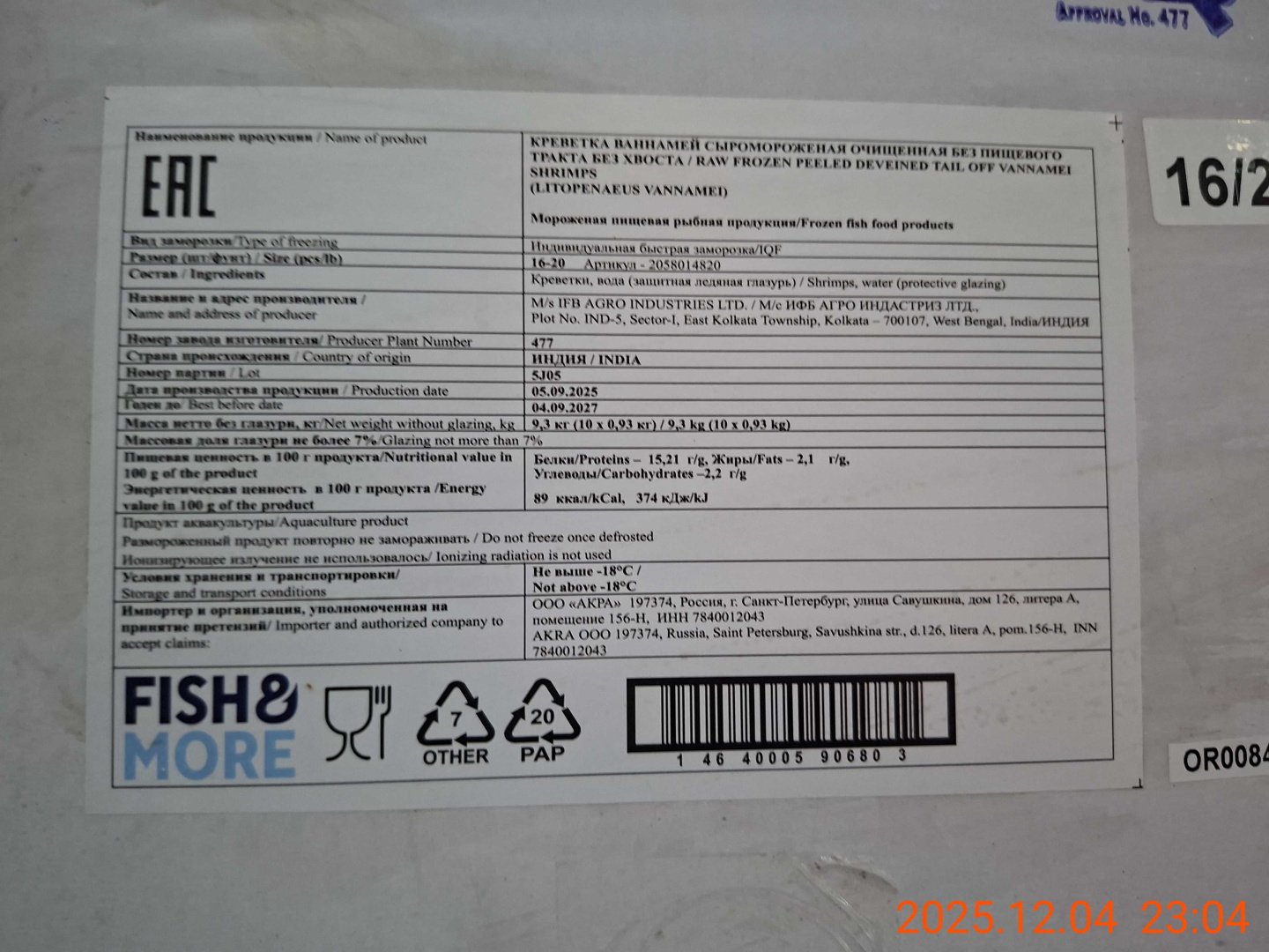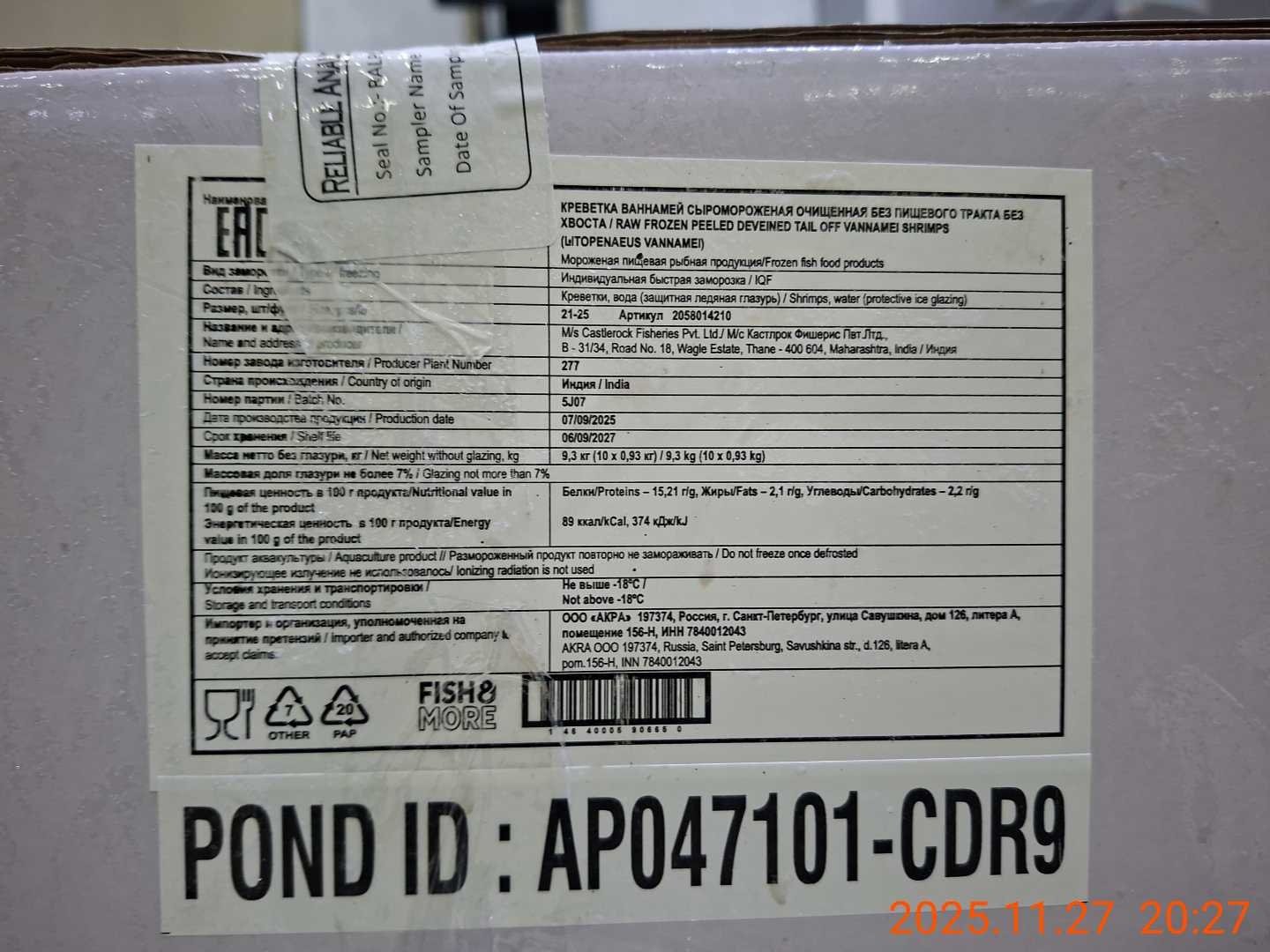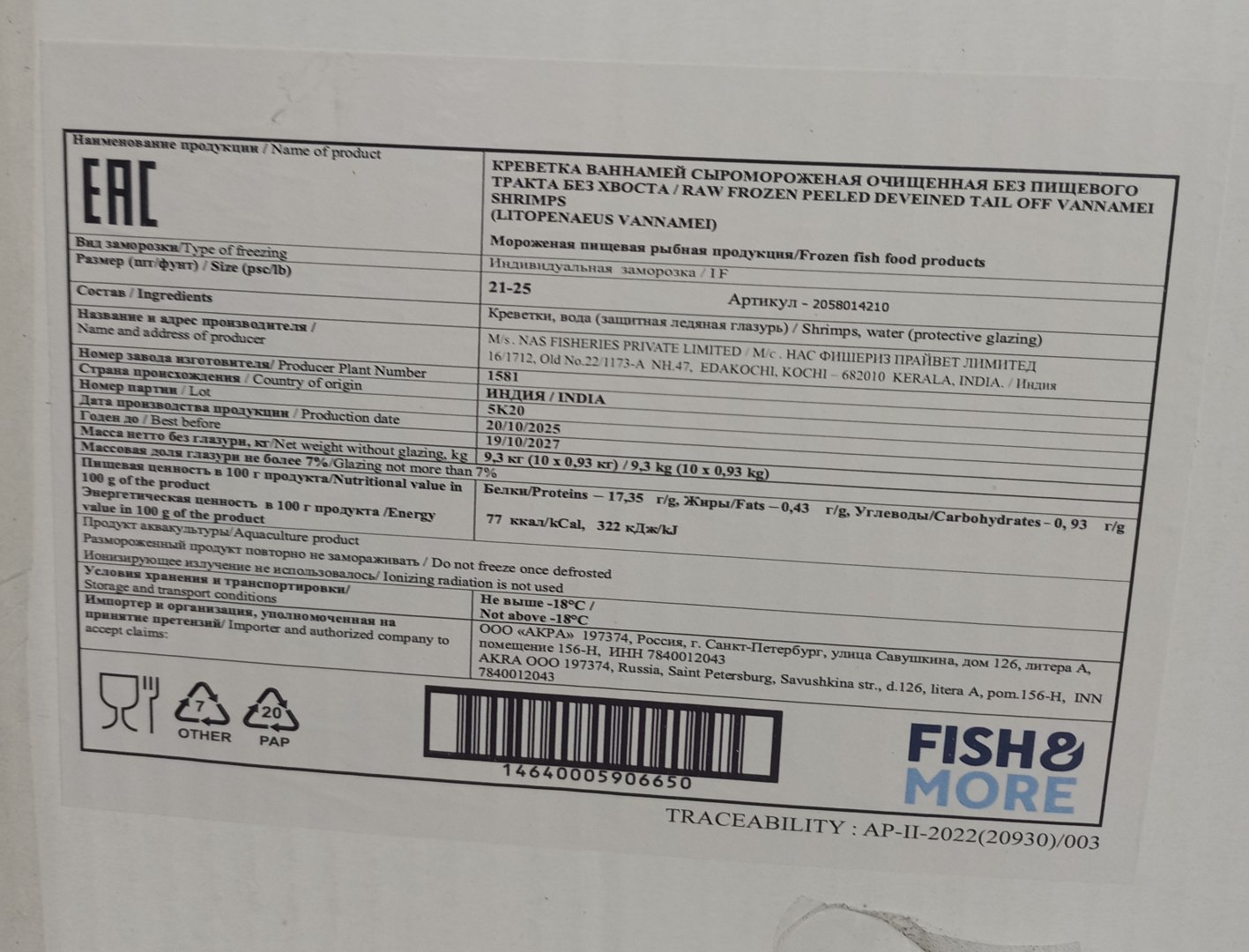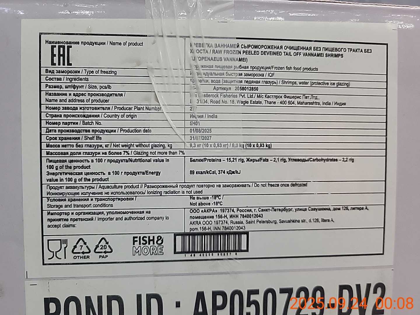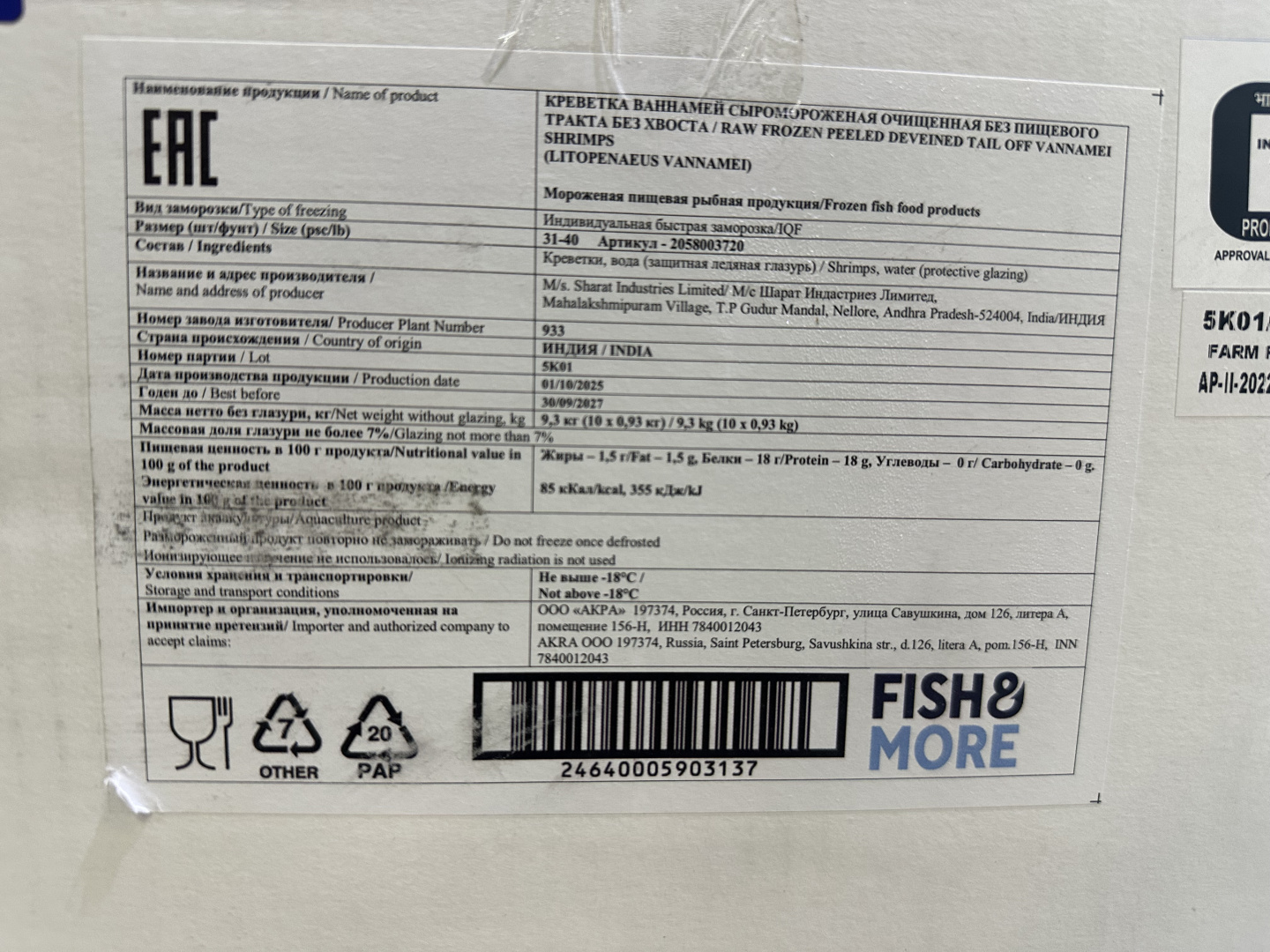 Креветка Ваннамей, очищ. б/пищ., с/м, индивид, не более 7%, 31-40 шт/фунт 0,93 кг, карт., 9,3 кг, Fish & More Переработка импорт (477)