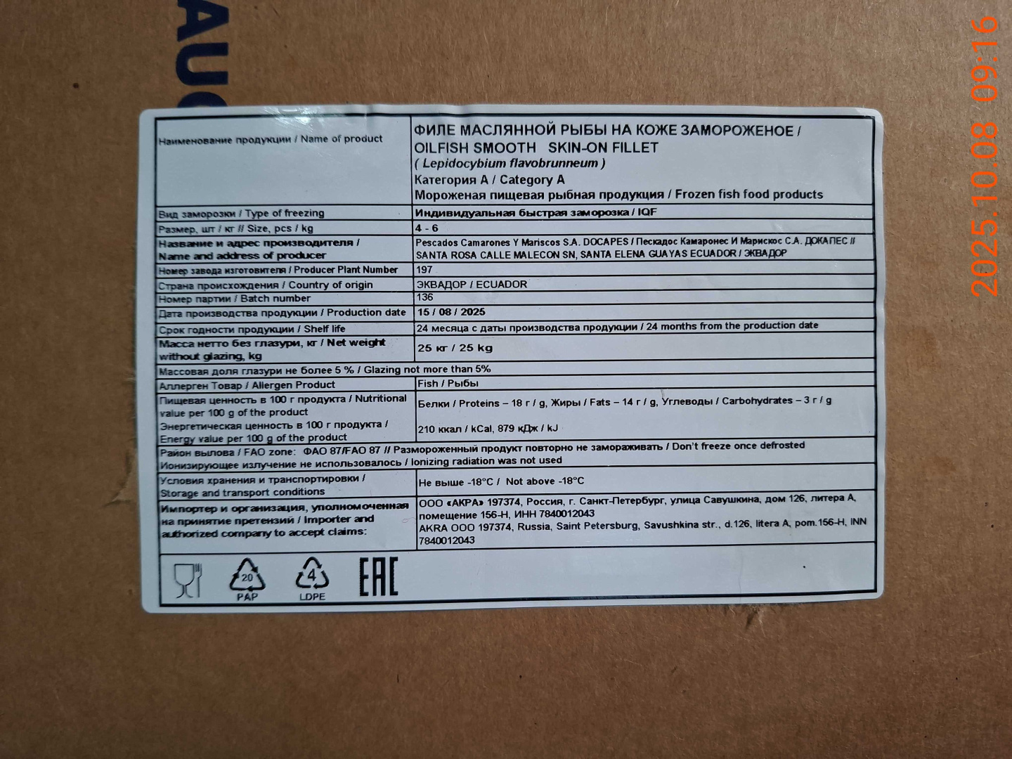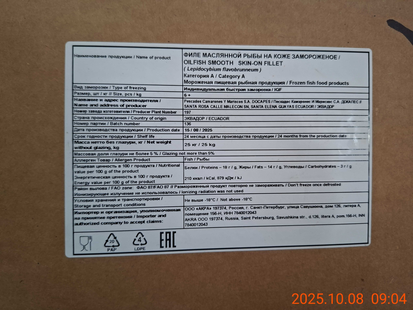Масляная рыба, филе н/к, с/м, индивид, не более 5%, 4-6 кг/шт, карт., 25 кг (197)