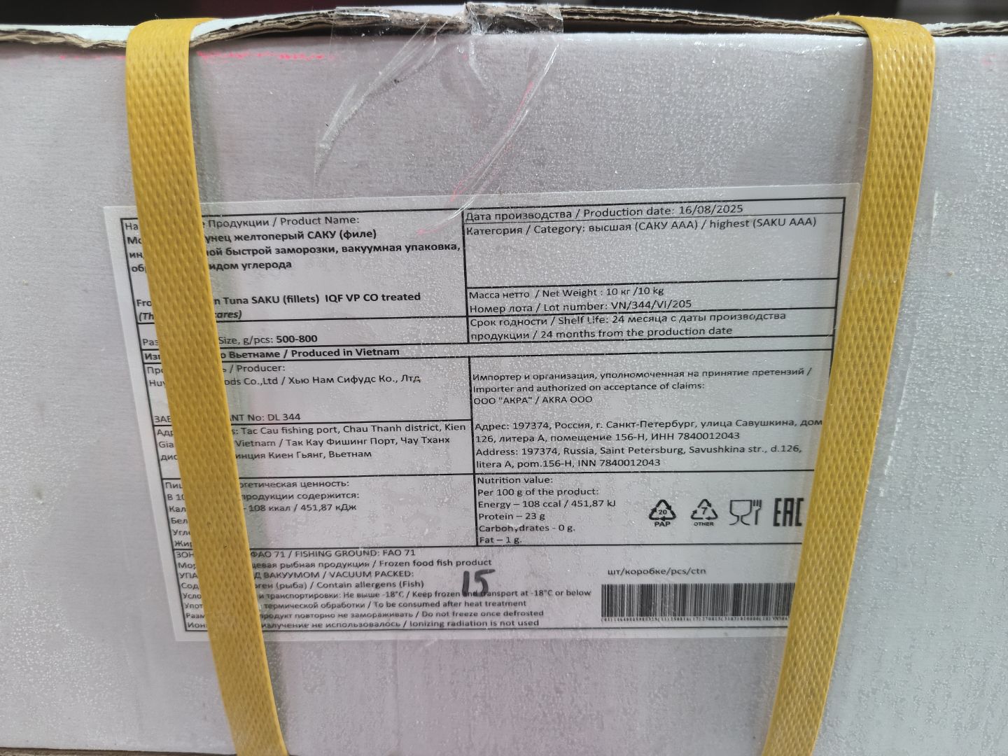 Тунец желтопёрый, АА, саку, с/м, 300-500 гр/шт, в/у, карт., 10 кг (DL 344)